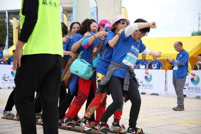 徒步大会沿途和终点分别设置了织网,同舟共济等互动游戏。