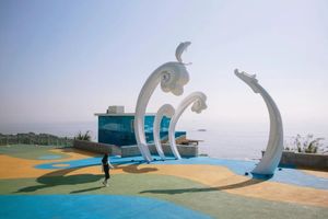 之后通过栈道,步行登上【山坪观景平台】,眺望一望无际的东海。在观景平台上可俯瞰妩人岙、道坦岩景观。妩人岙石滩与道坦岩地质公园对岸凝视,两两相望,互相对望,还可远眺玉环坎门、大麦屿等地。